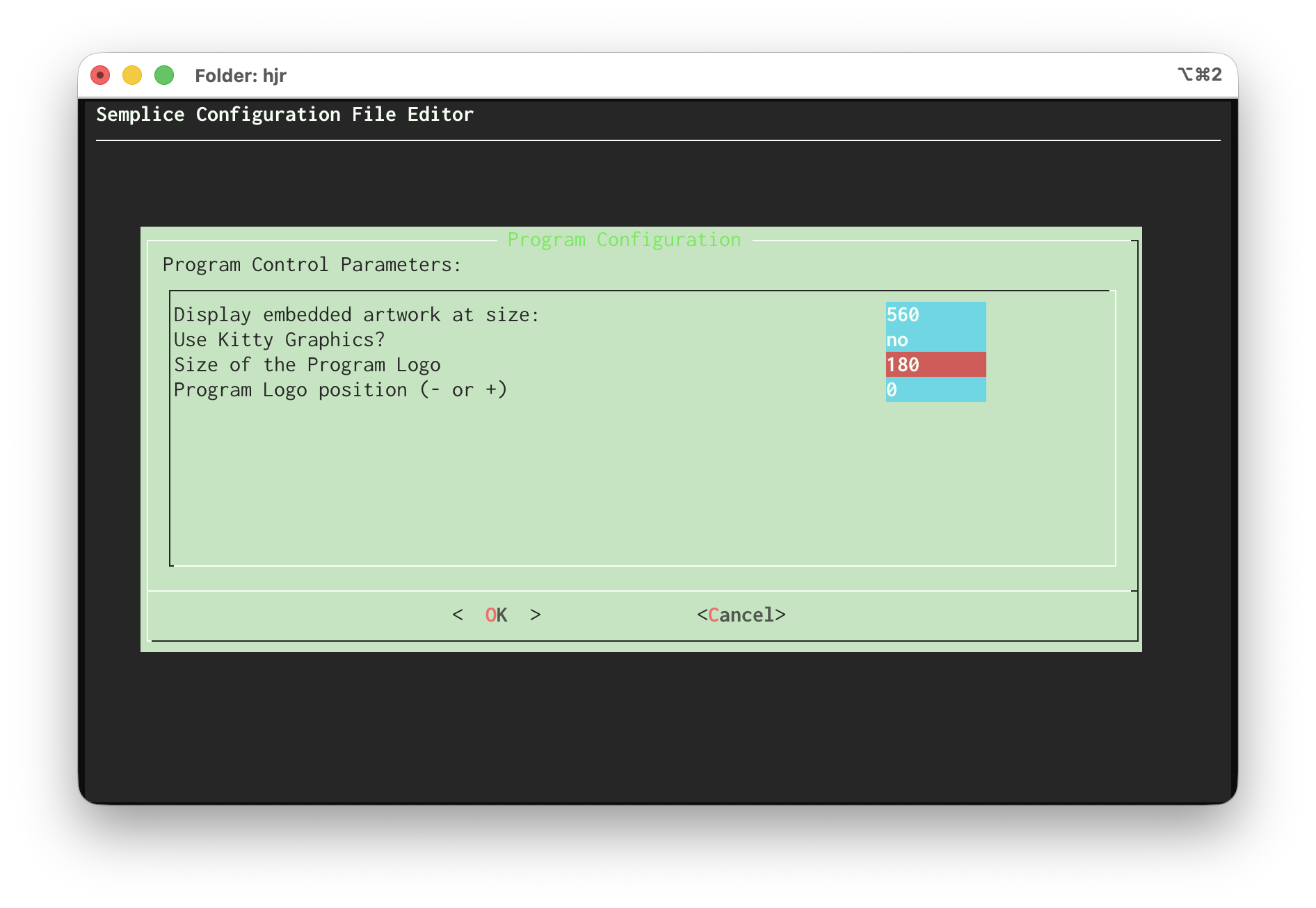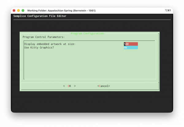 Here, I'm saying to use Sixel Graphics (because I've explicitly said “no, don't use Kitty graphics”) and to resize all embedded album art to 560×560 pixels. Note that the resizing does not respect aspect ratio: Semplice wants square album art, so if you don't present it with square art, it will force it to be square by picking one of the dimensions and forcing the other to match, no matter what that does to the stretched-ness of the result.