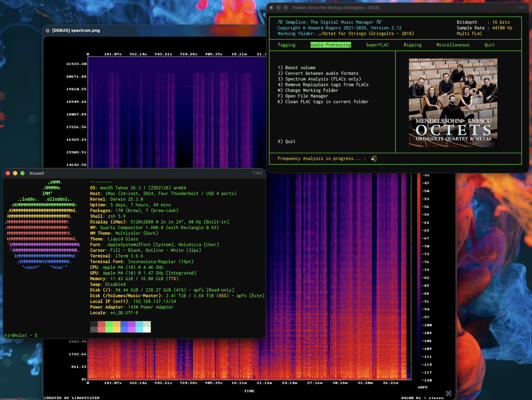 Bug-fix: On macOS, using the Audio menu, Option 3 to generate a spectrum analysis of a folder of FLACs would fail. You wouldn't see the error message (because Semplice suppresses it!) but under the hood, the error “display: delegate library support not built-in '' (X11) @ error/display.c/DisplayImageCommand/1907” was being generated, resulting in you seeing… nothing at all after the lengthy audio analysis process had taken place. That's an indication that the tool used to display the spectrum analysis graph was unable to find an X11 server (not exactly unusual in a macOS environment that doesn't natively use X11 at all!) The bug is now fixed: the code now tests for whether it's running on macOS or not and, if so, uses the Preview app to display the spectrum graph. Linux environments continue to use the ImageMagick display tool: