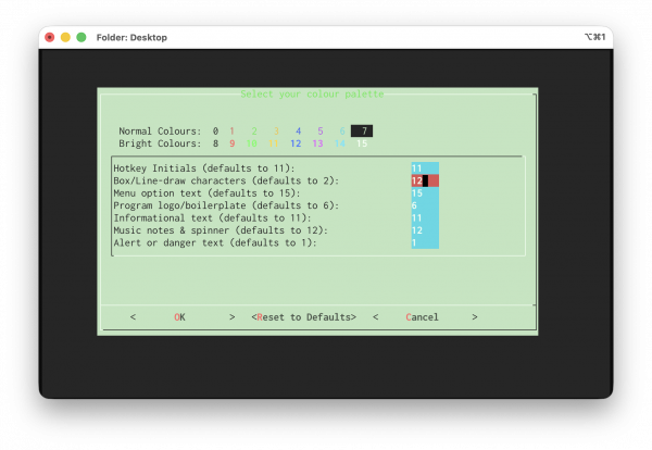 And so on. Basically, the feature is there to allow Semplice to be tweaked and configured to run decently on light-coloured terminals, but you can use it just to experiment and have fun too! If it all gets too much for you, just click the “Reset to Defaults” button and the 'normal' colour scheme will be restored, once you also press [Enter]. Bear in mind that whatever colours you pick for Semplice to use, they work in the context of the colour profile in use by your terminal emulator, so the results might not be quite what you expect. For example, without changing any of the colour defaults at all, the program logo text is meant to be displayed in cyan (or pale blue), but:
