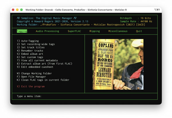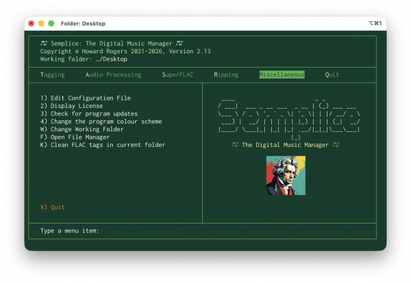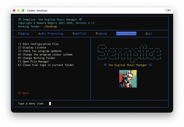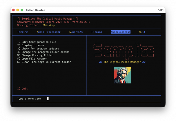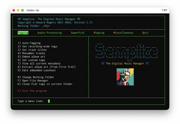 Minor Enhancement: When creating a SuperFLAC (SuperFLAC menu, Option 2), the program now auto-cleans the SuperFLAC as soon as it's been created. Previously, no cleaning took place unless the manual option to clean was taken (press 'K') or the quit program with post-processing option was specified (Quit menu, Option 1); now the freshly-created SuperFLAC is cleaned without you having to do the job manually. The process of 'cleaning' tags firstly removes non-canonical tags (such as 'Copyright' or 'Record Label' and adds one non-canonical tag, namely TAGDATE, which is then assigned the current system date/time in Unix Epoch format, so that a value of 1723631422 can later be converted to a human-readable date of Wednesday, 14 August 2024 10:30:22, thereby letting you know precisely when you created and/or tagged a FLAC into your collection. Thus, SuperFLACs created in earlier Semplice versions lacked a TAGDATE tag, but was otherwise in possession of all the canonical tags. This new release therefore simply ensures that freshly-created SuperFLACs do indeed get created with a TAGDATE tag.