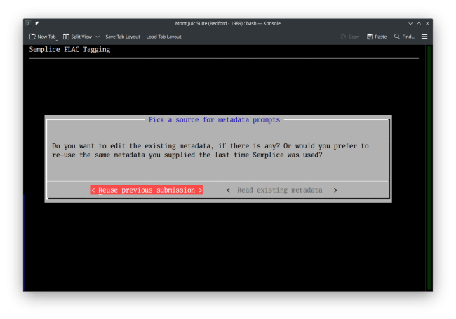 You are asked to choose whether the next screen should display metadata read from the first of the FLACs in the working folder, or if the metadata you supplied when last using Semplice should be displayed instead. You'd select the 'Reuse previous submission' option if you were, for example, tagging the second symphony ripped from a CD: you've probably already spent time carefully tagging the first one and nearly all the details for that first symphony would apply unchanged to the second, so it would make sense to re-use that first symphony's metadata as a template or model for this second symphony. By contrast, you'd use the 'Read existing metadata' if your previous Semplice session had been spent tagging up, say, an opera that had no relationship at all with the new string quartet you're now moving on to tag: the previous session's metadata would be useless for the new recording, and the new recording may have some usable metadata already in it (depending on where you bought it from, I guess!). Pick one of these options and press [Enter]: for the sake of demonstration, I'll choose the 'read existing metadata' option: