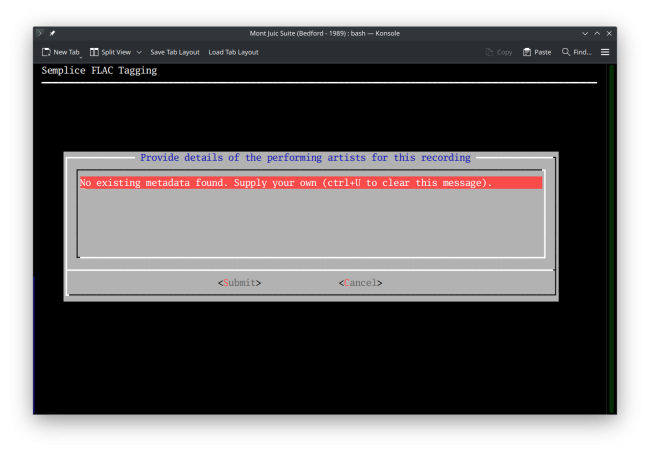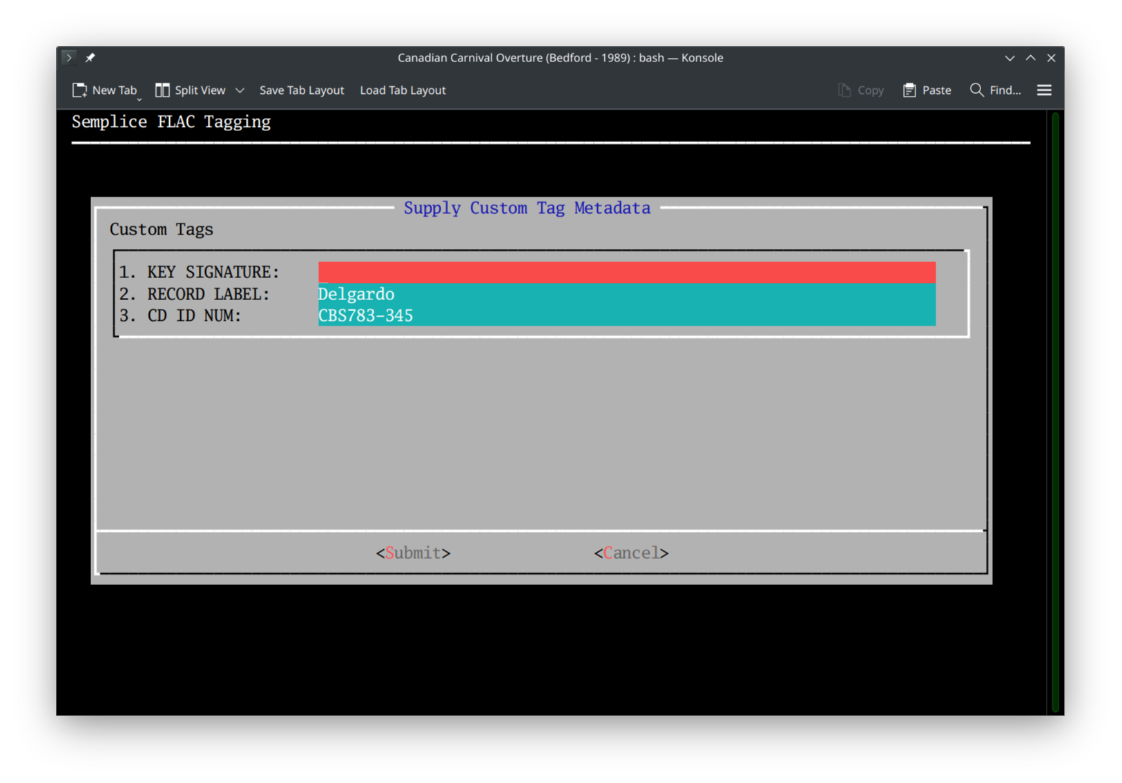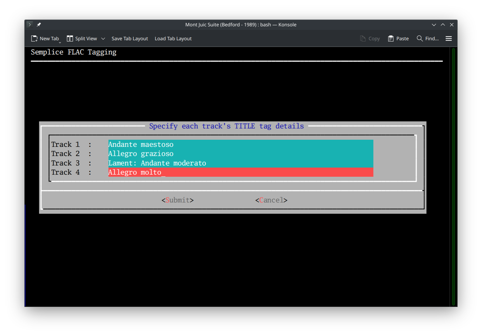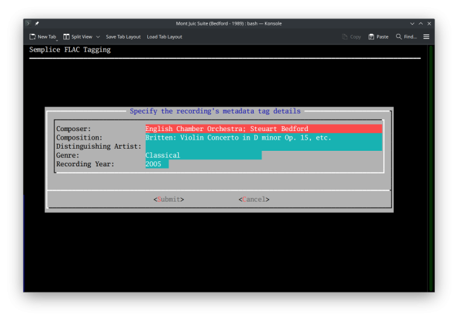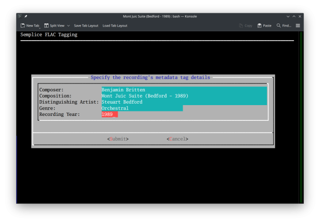 If you click Cancel, your data entry up to that point is lost and nothing is written to the FLAC files: you are returned to Semplice's Tagging menu without any file alterations having been made at all. If you click the Submit option, however, then your data is saved to memory -but not yet written to the FLACs themselves (so, if you accidentally press [Submit], you can then press Ctrl+C to terminate Semplice entirely, and your FLACs will still not have been altered).