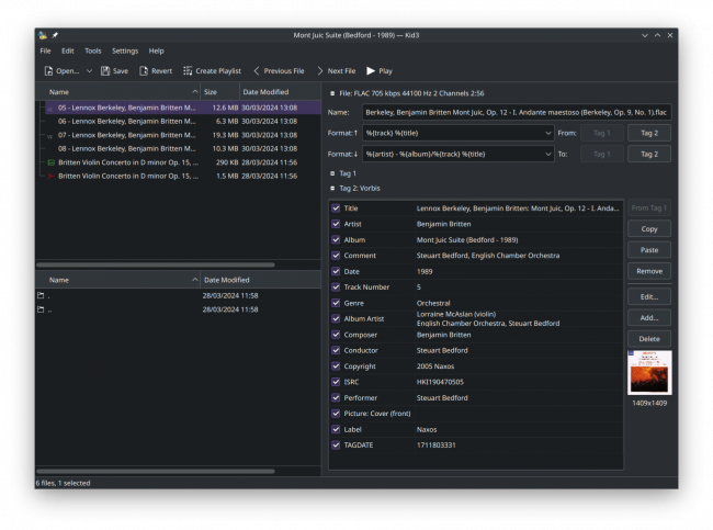 Now, you can see that ARTIST is 'Benjamin Britten'; DATE is '1989', GENRE is 'Orchestral' and COMMENT is the 'Steuart Bedford, English Chamber Orchestra' entry I made on the second of the recording-wide tag entry screens above. We see evidence, therefore, that the new metadata has been written to these FLACs -though you might note, in the top left-hand corner, that the file names have not been touched and, specifically, the files start with numbers 5, 6, 7 and so on. You can also see that TRACK NUMBER is set to 5 for the first of these files: supplying recording-wide tag data does not change anything about the FLACs or their metadata beyond what you were prompted to supply, in other words.