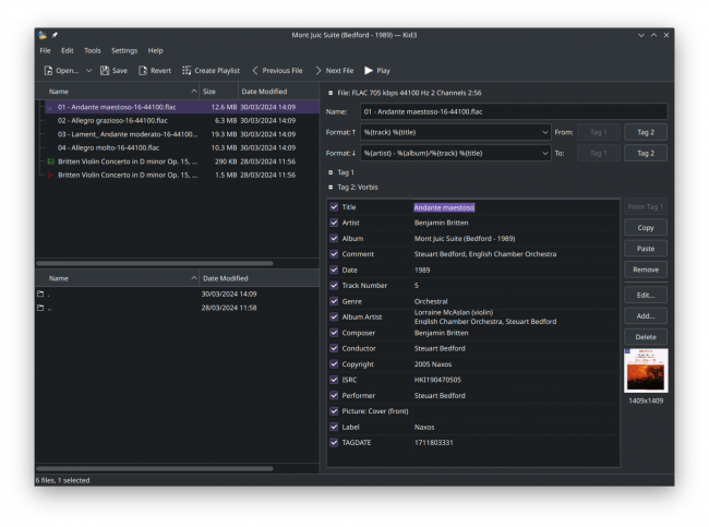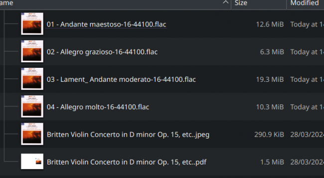 There are a couple of things to note here. Firstly, the TITLE tag is now a lot shorter than it was originally. Clearly, the 'minimal musical facts' that I entered on the per-track tagging form has now indeed been applied to the physical FLAC files. Secondly, however, look in the top left-hand corner of the screenshots: whereas before I was dealing with files called things like '05 - Lennox Berkeley, Benjamin Britten M…', I'm now working with files called '01 - Andante maestoso-16-44100.flac'. Writing TITLE tags triggers Semplice, in other words, to apply the TITLE to the physical file name itself …and to start numbering the files in the folder from zero-padded 1 (that is, the first file here used to be called 05… but is now 01…).
