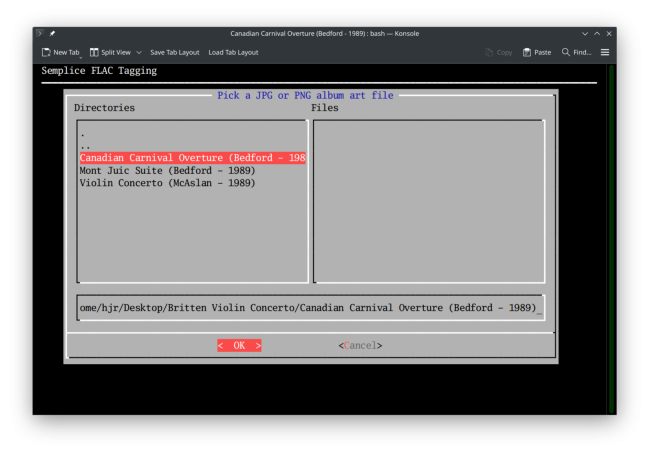 Make sure you actually press [Spacebar] when the JPG or PNG is highlighted in the right-hand panel: you want the horizontal panel's text to specify the complete path and filename of the image you're selecting. Here, you see 'R-413…jpg' does appear, spelled out, in the horizontal panel, so I'm good to click [OK] (or press [Enter]). If I were to click [Cancel] (or select it with arrow keys and [Tab] presses and then press [Enter]) I would be returned to the Semplice Tagging menu, with nothing having been written to the FLACs in my working folder.