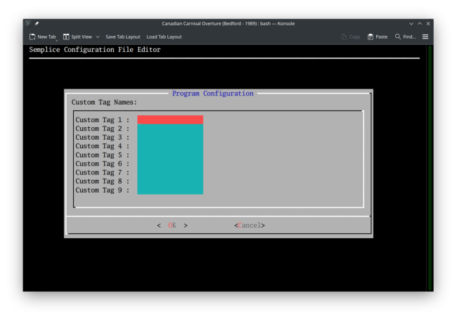 At the end of the second page of configuration options, you'll see the last item is simply labelled 'Use Custom Tags', to which you answer yes or no. The default is 'no', so you need to deliberately change that here before pressing [Enter]. Do so, however, and you'll immediately be taken to this screen: