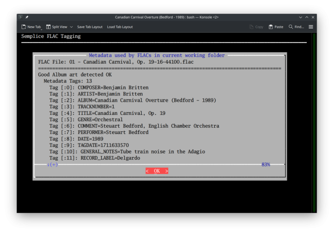 Here's where you see that, though Semplice displays the custom tag prompts with spaces, in reality they are embedded within the FLAC with underscores (look at 'CD ID NUM', for example, and see how it is stored as CD_ID_NUM). Similarly, where I had originally said 'General Notes' in mixed case when editing the configuration file, you can see from above how it has been stored as GENERAL_NOTES, all in upper case.